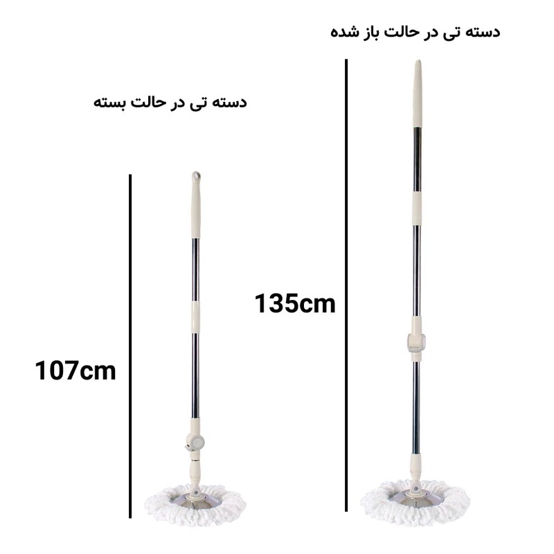 – دسته طی دارای 2 میله هست که با وصل کردن آنها به هم می توانید براساس نیاز طول دسته را کم و زیاد کنید و قسمت های مثل زیرمبل ، دیوار و حتی شیشه ها را بدون اینکه فشاری به کمر بیاید با این طی تمیز کنید. جنس پد این طی از میکروفایبر است که بسیار بادوام بوده و به هیچ عنوان پرز نمی دهد و جذب آب آن بالاست. یک دیسکت استیل دایره ای شکل به پد وصل می شود که قابلیت چرخش 360 درجه ای را به طی می دهد تا گوشه ها بهتر تمیز شوند. در صورتی که تمایل داشتید می توانید پد میکروفایبر را جدا کنید و درون ماشین لباسشویی بندازید.